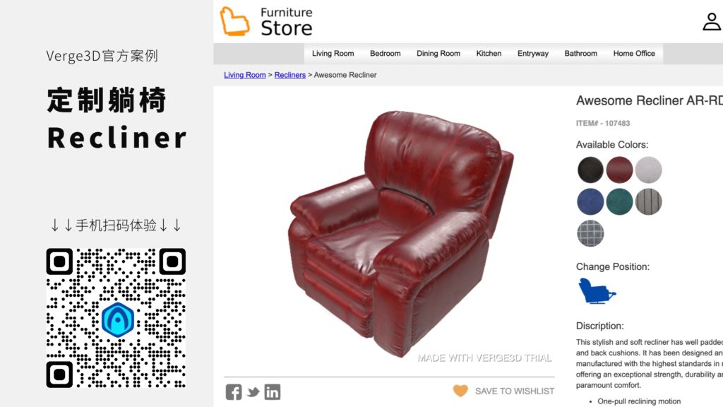 定制躺椅 – ReclinerVerge3D应用 · 2021年8月5日 · 320 次浏览 这是一个使用Verge3D制作的躺椅沙发电商页面案例,请扫码体验,或者点击链接在新窗口中打开。 标签:Verge3D应用